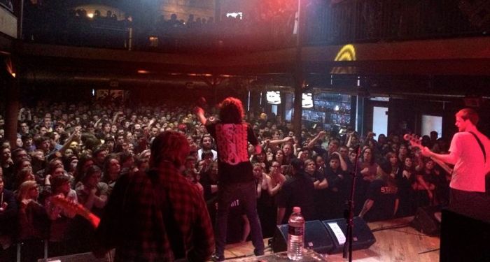 The concert was very much a standard pop punk show and the voiceovers made it different. Still it was a pop punk show and thus a good fit for the Marlin Room. The low stage made stagediving easy and moshing almost a must. Songs like “Skin Deep” had the audience in such a fervor that a few moshers went down, but luckily the young crowd (it was a 16+ show) got everyone back on their feet without incident. If someone emerged from the pit holding his head or an arm, they were immediately checked on by fellow concertgoers. Similarly when one girl tripped on stage, whilst zig-zagging behind Lambton to get to the outstretched arms of stage left, everyone took a beat to check whether she was ok. The stage diver immediately popped back up. Perfectly fine, but perhaps embarrassed, she jumped energetically off the stage and continued to do so for the rest of the night.