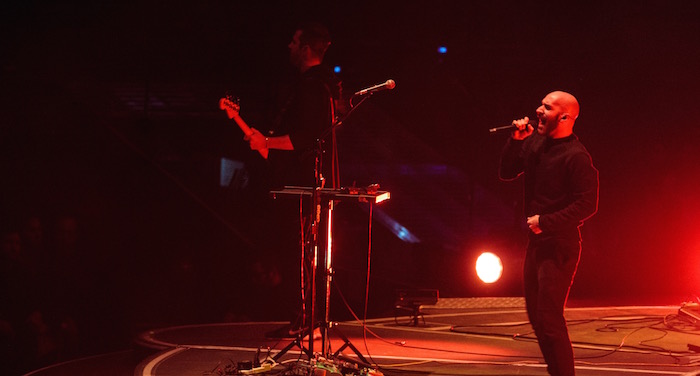 The guys started the night out with “Loveless.” Each stood close to the edge of the circular stage, standing like the points of a compass, in darkness, until red and purple lights began to illuminate them. Eventually Sam Harris would leave his spot, making his way around the stage. He’d stop to sing directly to fans up front, occasionally getting down on one knee. During “Hang On,” he raised a hand in the air and fans followed suit. Casey Harris danced wildly at his keyboard, especially during “Love Songs Drug Songs,” when he jumped up and down, looking a bit like a mini Michael Jordan at home in the United Center.