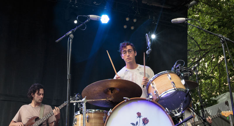 As soon as Whitney’s set finished, people began running over to the Red Stage to catch another Chicago band: Twin Peaks. Excitement and plenty of pollen was in the air. Up front, kids were tightly packed in, like sardines. The VIP section was packed with friends, family, and fellow musicians. Jimmy Whispers and a few members of Whitney watched from the side of the stage. Shamir, who was on hand to headline the Blue Stage, joined fans up front, leaning on the barricade, while smoking a cigarette. Cheers boomed as guitarist Clay Frankel, bassist Jack Dolan, drummer Connor Brodner, and keyboardist Colin Croom walked out on stage. Then Cadien Lake James came rolling out towards center stage, in a wheelchair. He smiled, stood up, and shouted, “Just kidding!” Those in on the joke broke into laughter, but the gaggles quickly stopped once the guys began playing. With the band’s second Pitchfork performance, an air a maturity oozed from the stage. My, how much the guys have grown since their debut Pitchfork performance! On Twitter, Twin Peaks promised a few surprises. Those surprises came by way of the three-piece horn section, giving added depth and texture to Twin Peaks songs, but especially the song “Walk to the One You Love,” from album number three, Down In Heaven. Will Miller (of Whitney and Cecil), Irving Pierce, and Kevin Decker (a member of Joe Bordenaro’s backing band) played trumpet, saxophone, baritone, and flute. Of course Twin Peaks played plenty of oldies, like “Stand in the Sand,” “Flavor,” and “Telephone,” which got everyone riled up.
