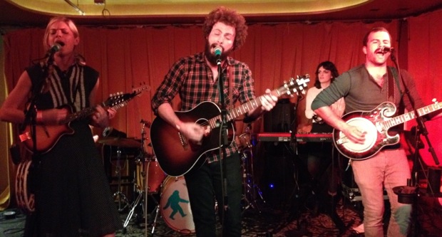 Downstairs a more indie-folk vibe prevailed, with the Los Angeles-based Miner (above), a “family affair” led by husband-and-wife duo Justin and Kate Miner. They started off their set with the gentle, lusciously harmonized “Dawn.” Gaining momentum, Justin launched into “Golden Ocean” with his resonant voice, and was joined by a foot-stomping full chorus, a recurring characteristic throughout several of Miner’s songs.